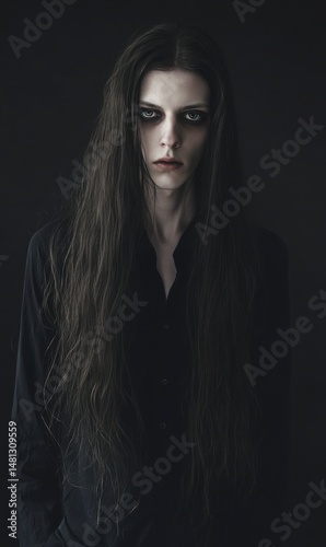 © Rattanachai, Fototapeta premium Portrait Of A Pale Woman With Long Dark Hair And Intense Gaze In A Dark Setting