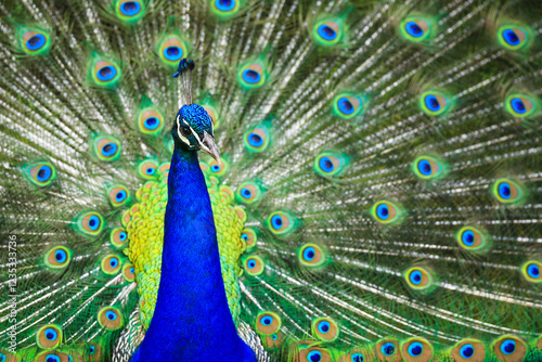 © Alex Green, Fototapeta premium Portrait of a peacock displaying his beautiful tail