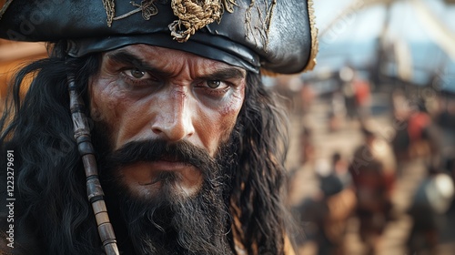 Fototapeta premium Portrait of a pirate navigator in the waters of the Caribbean in the 17th century. Pirate with a thick black beard and a terrible appearance.