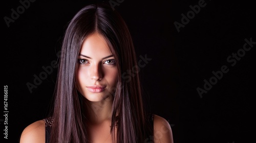 © Oleksandr, Fototapeta premium Portrait of a poised and beautiful woman with long brown hair and striking eyes, captured against a dark backdrop in a captivating image.