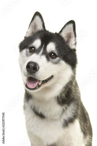 © Elles Rijsdijk, Obraz premium Portrait of a pretty husky dog looking away with mouth open isolated on a white background in a vertical image
