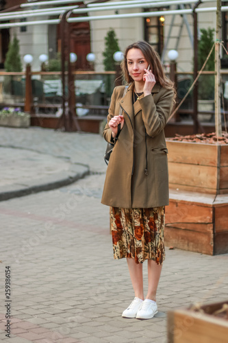 Naklejka premium Portrait of a pretty young business lady is negotiating on the phone. The girl uses gadgets. Lifestyle photos. Stylish clothes