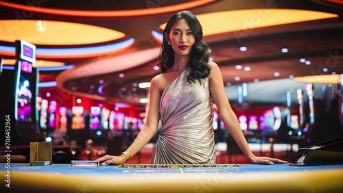 © Kitreel, Fototapeta premium Portrait of a Professional Female Croupier Looking at the Camera and Welcoming You to a Table. Beautiful Asian Dealer in Silver Dress Dealing Playing Cards in a Casino for a Game of Baccarat