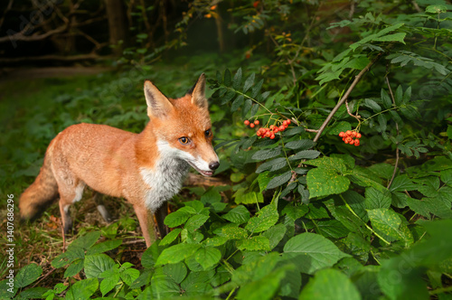 Naklejka premium Portrait of a red fox eating rowan berries in a forest
