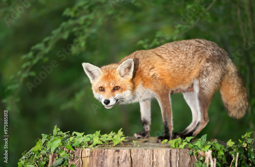 Naklejka premium Portrait of a red fox standing on a tree stump in a forest