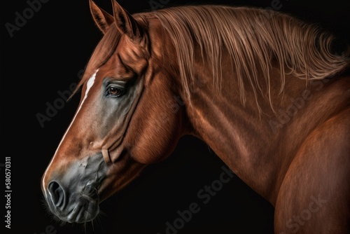 © AkuAku, Fototapeta premium Portrait of a red horse in a studio against a black background. Generative AI