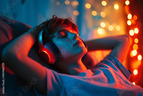 Obraz premium Portrait of a relaxed teenage child listening to music wearing headphones....