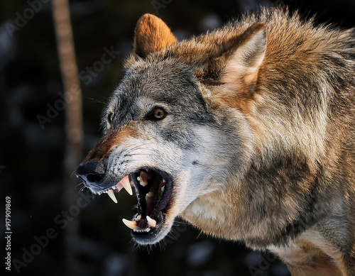 © sebi_2569, Fototapeta premium Portrait of a roaring wolf. A wolf showing its fangs
