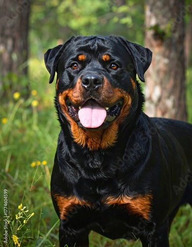 © sunar, Obraz premium Portrait of a Rottweiler dog in a forest setting.
