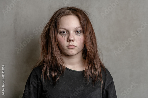 © Ermolaev Alexandr, Fototapeta premium Portrait of a sad teenager on grey background