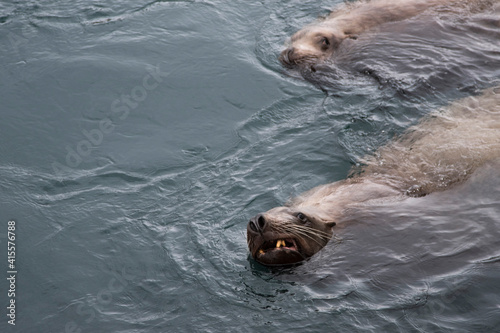 Obraz premium portrait of a sea lion floats on the water, looks towards the viewer, his mouth, mustache, teeth and eyes are visible. another sea lion is swimming nearby. the action takes place in the afternoon