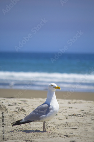 © Kimmer, Obraz premium Portrait of a seagull on the beach with blurred background
