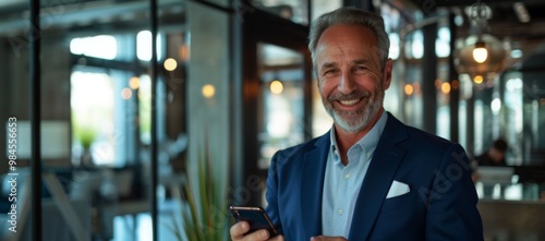 © Deris Firmansyah, Naklejka premium Portrait of a senior gray-haired male doctor standing in a suit outside the office and using a mobile phone, reading the news, typing a message, waiting for an appointment.