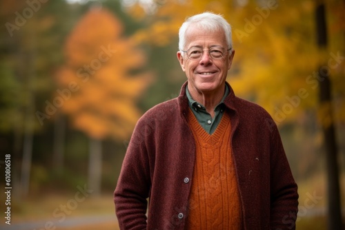Obraz premium Portrait of a senior man standing in the park with autumn leaves in the background