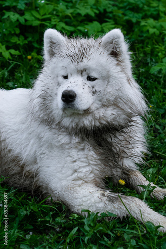 © Albina, Obraz premium Portrait of a serious looking dirty samoyed dog