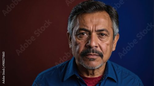 © lovey, Fototapeta premium Portrait of a Serious Senior Man with a Beard in Blue Clothing - Authentic Headshot Capturing Mature Confidence and Intriguing Personality