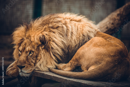 © Inception, Naklejka premium Portrait of a sitting lions couple close-up in the zoo. Male and female lion.