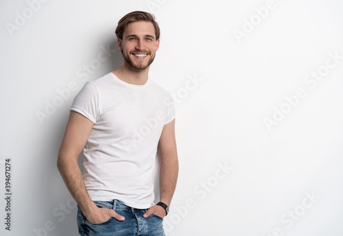 Fototapeta premium Portrait of a smart young man standing against white background.