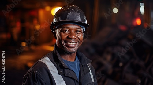 Fototapeta premium portrait of a smiling african american steel mill worker in a hard hat and...