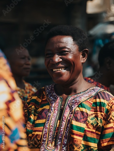 © Woranuch, Obraz premium Portrait of a Smiling African Woman in Vibrant Traditional Clothing.