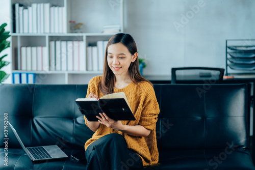 Fototapeta premium Portrait of a smiling Asian woman sitting on a sofa. Using laptop in the...