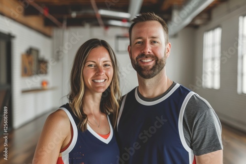 Fototapeta premium Portrait of a smiling caucasian couple in their 30s dressed in a high-performance basketball jersey over empty modern loft background