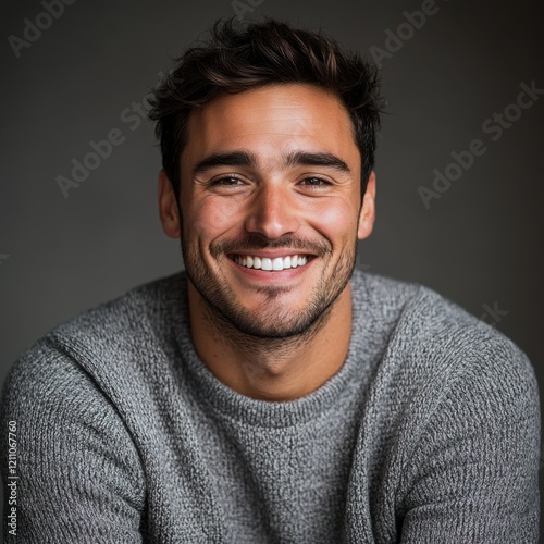 © Maftuh, Obraz premium Portrait of a Smiling Man in a Grey Sweater