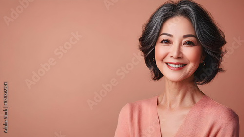 © Siasart Studio, Obraz premium Portrait of a smiling mature woman with grey hair against a peach background.