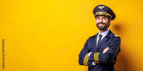 Fototapeta premium Portrait of a Smiling Pilot in Uniform Against a Yellow Background