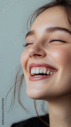 © CoreVisuals, Obraz premium Portrait of a smiling woman with joyful expression, soft lighting.