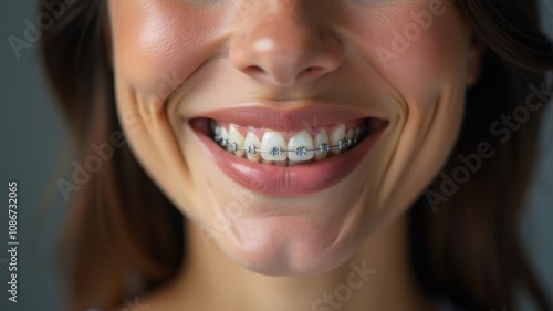 © marishkaTR, Obraz premium Portrait of a smiling woman with orthodontic braces in close-up. Orthodontics, dentistry