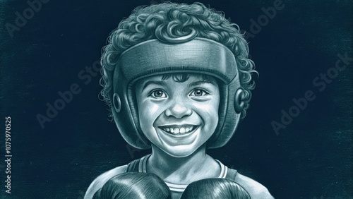 Fototapeta premium Portrait of a Smiling Young Boxer with Headgear and Gloves