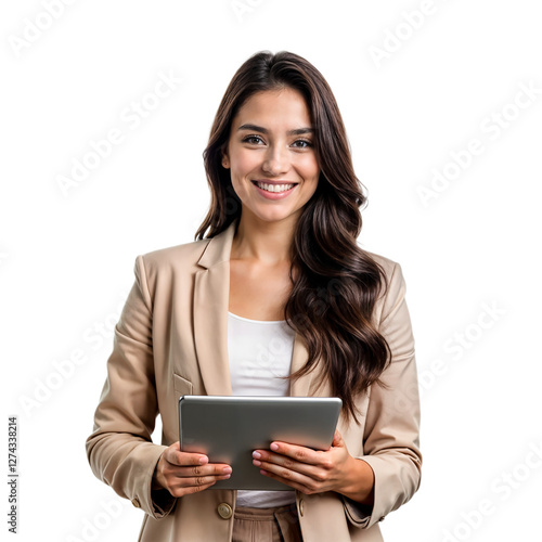 © AhmadReshad, Fototapeta premium Portrait of a smiling young businesswoman holding a tablet isolated on a transparent background, Png.