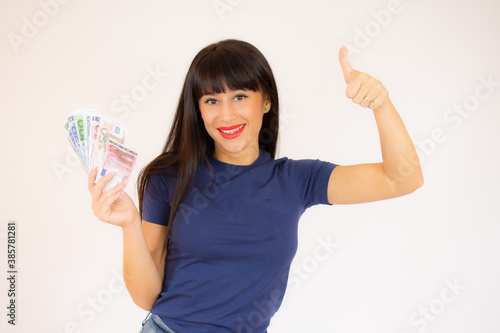 © Danko, Obraz premium Portrait of a smiling young girl showing bunch of money banknotes and giving thumbs up isolated over white background