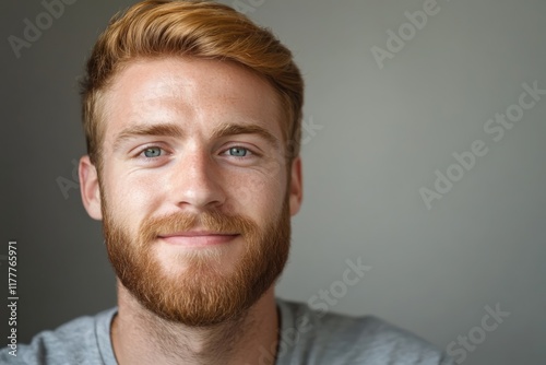 © J. Grayscale, Fototapeta premium Portrait of a Smiling Young Man with a Beard Against a Neutral Background