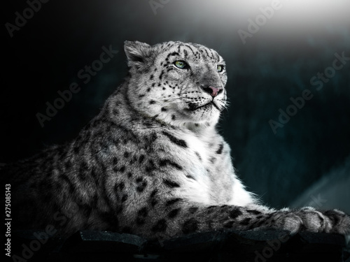 © Евгения Шихалеева, Fototapeta premium Portrait of a snow leopard. Turquoise background. Beautiful picture.