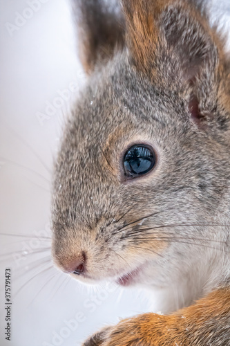Obraz premium Portrait of a squirrel in winter on white snow background