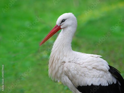 © fotomaster, Fototapeta premium portrait of a stork in the wild on a green background