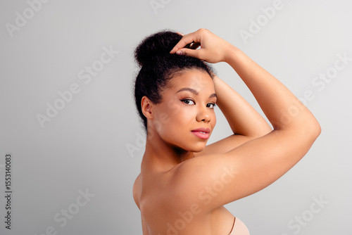 © deagreez, Obraz premium Portrait of a stunning young woman with natural hairstyle posing on a neutral background highlighting elegant beauty