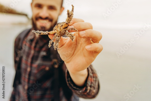 Obraz premium Portrait of a stylish bearded man with a small crab in his hands during the first tour of the sea