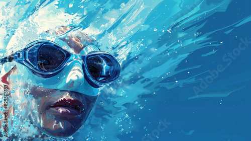 Fototapeta premium Portrait of a swimmer with a white cap and blue goggles underwater, with...