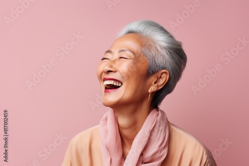Fototapeta premium Portrait of a tender asian woman in her 70s laughing isolated in pastel or...