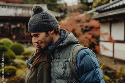 © Markus Schröder, Fototapeta premium Portrait of a tender caucasian couple in their 30s dressed in a thermal insulation vest in backdrop of a traditional japanese garden