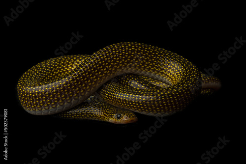 © Soumabrata Moulick, Fototapeta premium Portrait of a twin-spotted wolf snake against a black backdrop