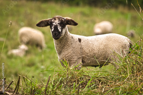 © Brinja, Naklejka premium Portrait of a very cute grey newborn lamb in the meadow