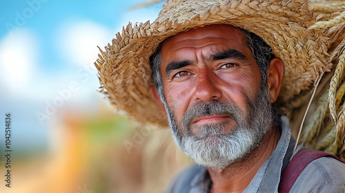 © Siasart Stock, Fototapeta premium Portrait of a weathered man wearing a straw hat, exuding wisdom.