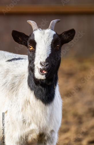 Fototapeta premium Portrait of a white and black derpy looking Goat in the Pastures