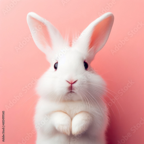 © Igor, Naklejka premium Portrait of a white cute rabbit with surprised expression on a pink background. ai generative