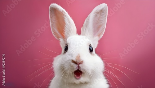 Obraz premium Portrait of a white cute rabbit with surprised expression on a pink...