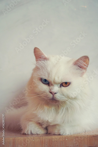 Fototapeta premium Portrait of a white fluffy cat with different eyes. Pet, Persian beautiful cat